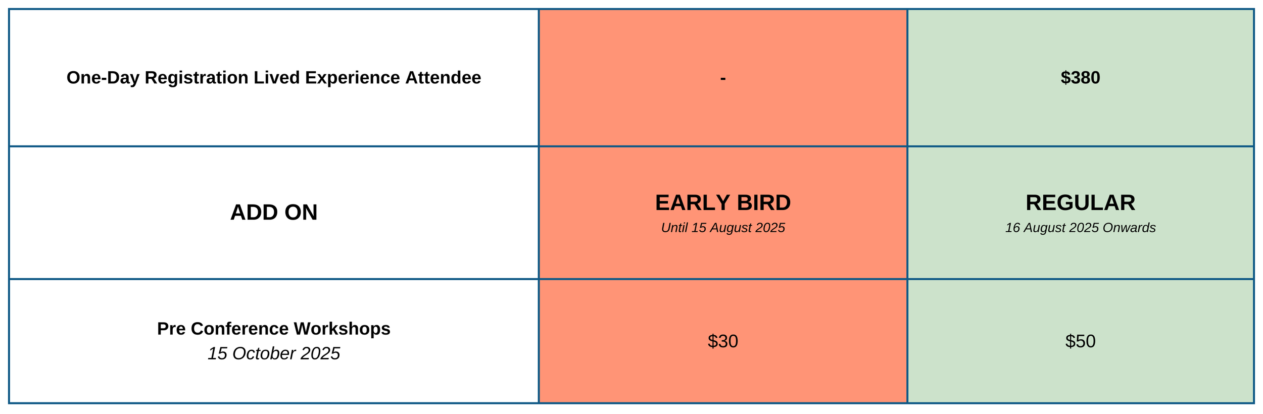Pre conference workshop (Wednesday 15 October) registrations can be added on to your registration at a small additional cost